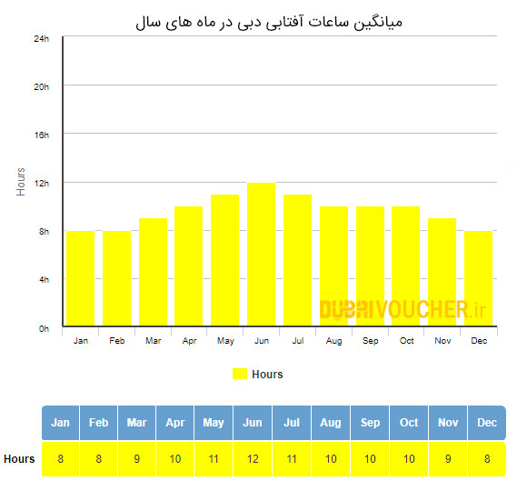 میانگین ساعت های آفتابی دبی بین ۸ تا ۱۲ ساعت می باشد و از ماه ژانویه، فوریه و دسامبر ۸ ساعت است، برای ماه مارس و نوابر ۹ ساعت، برای ماه آپریل، اگوست، سپتامبر و اکتبر ۱۰ ساعت، برای ماه می و جولای ۱۱ ساعت است و بلندترین روز های سال و گرما در ماه جون می باشد.