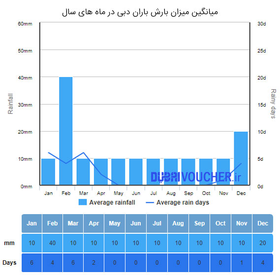 بارش باران یک رحمت الهی است، ولی برای توریست ها یک معضل محسوب میشود. از این بابت دبی برای توریست ها خیلی مناسب است و روزهای بارانی کمی دارد، پس نگران نباشید. احتمال بارش باران در سال کمتر از ۷% میباشد.